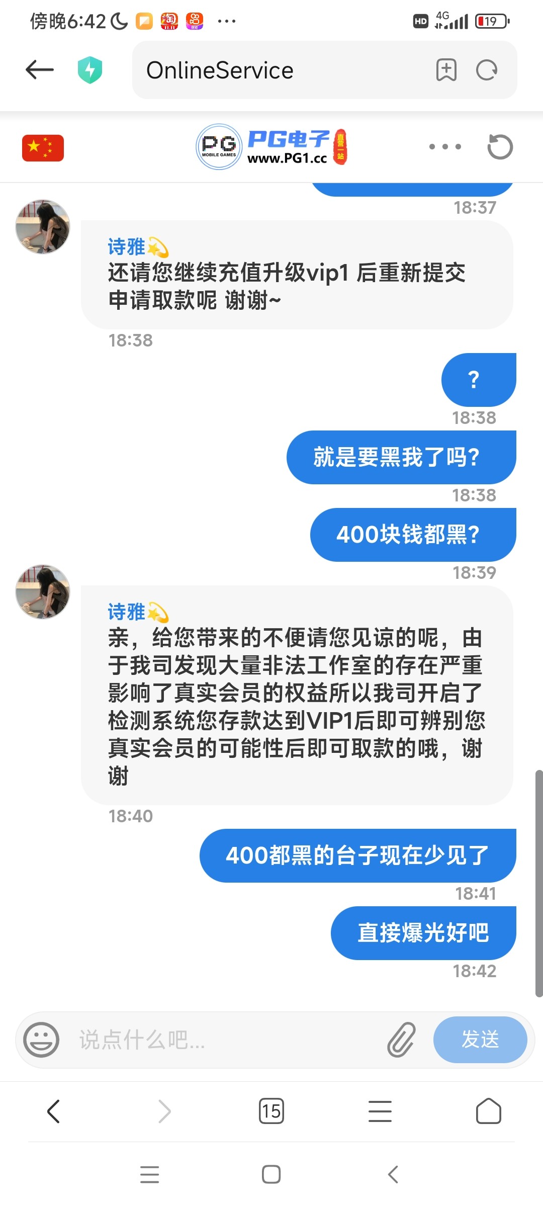 刚开始白嫖到一百,不给提现说要任意充值才能提现,现在充值了50打到400,提现又说要充值1000才能提现。大家避坑吧www.PG1.cc