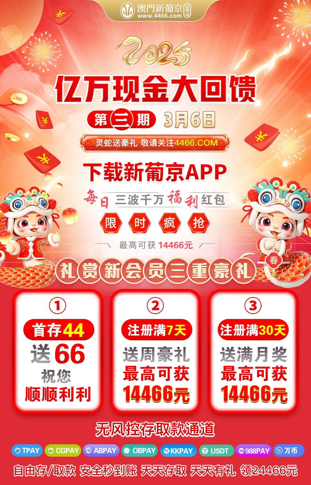 【澳门新葡京】每日三波千万福利红包免费领取,最高可获14466元