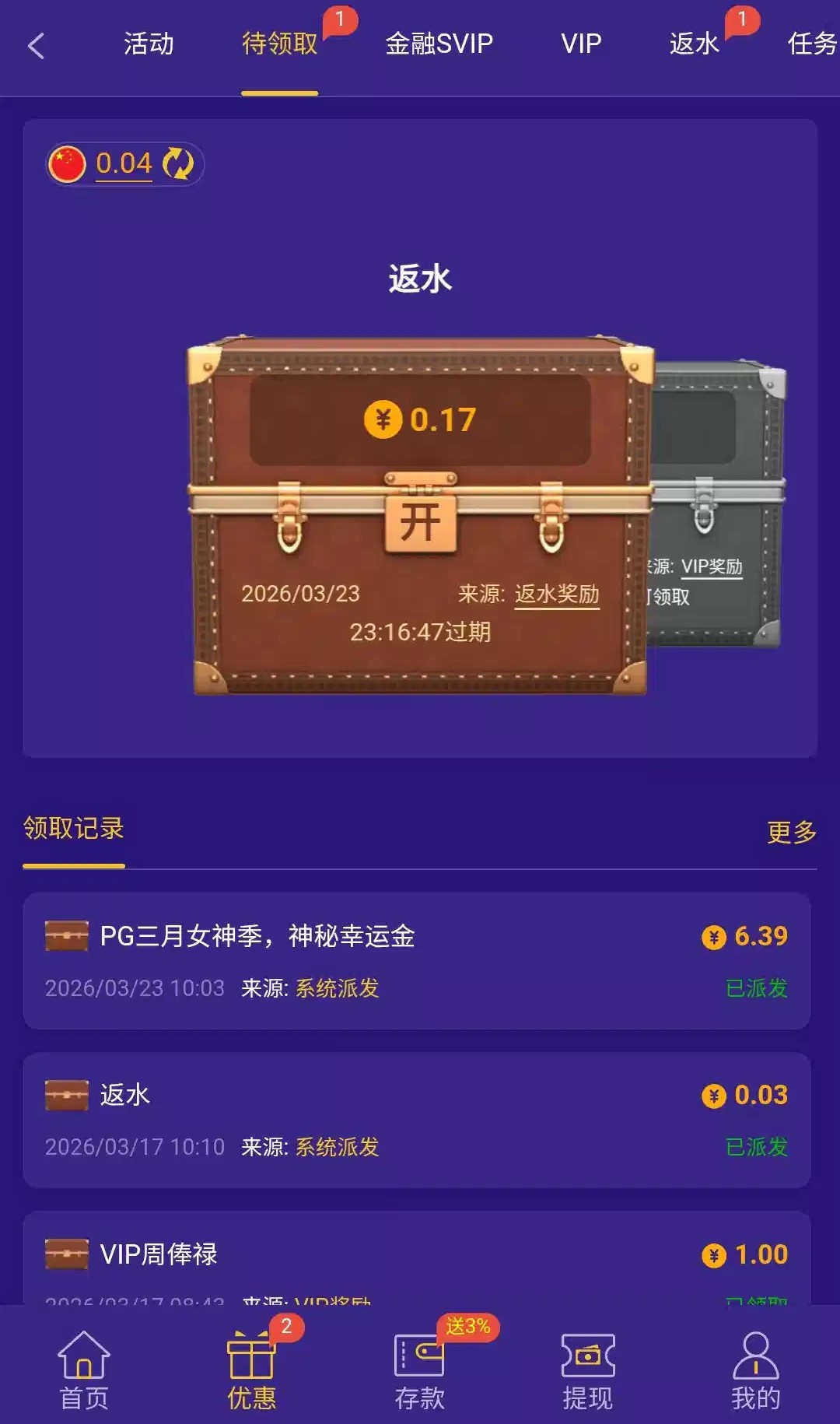 近期有充值的老哥可以登入上查看优惠待领取是否有此彩金