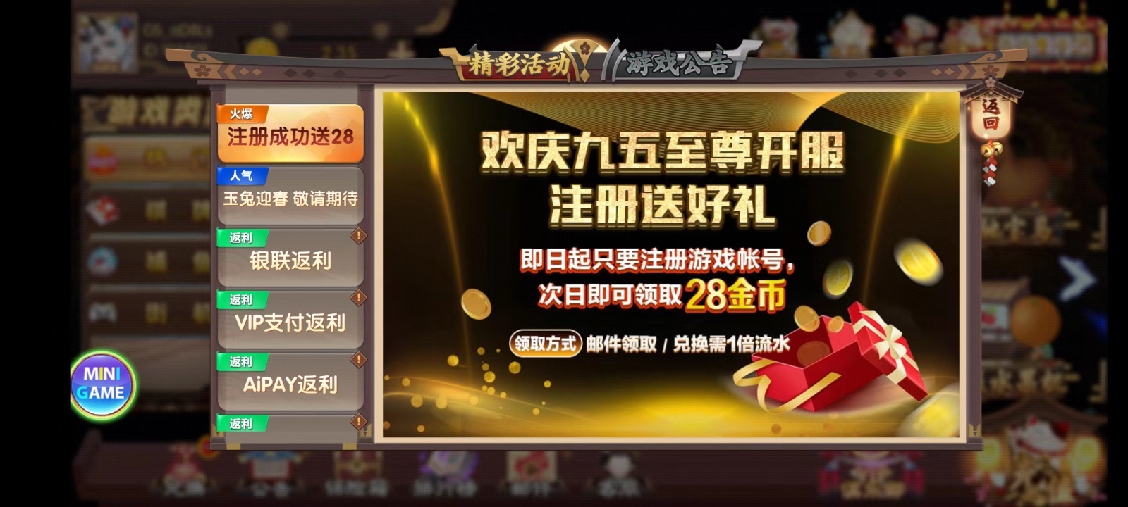 新用户注册绑定银行卡/次日邮件自动派送28/100提现。