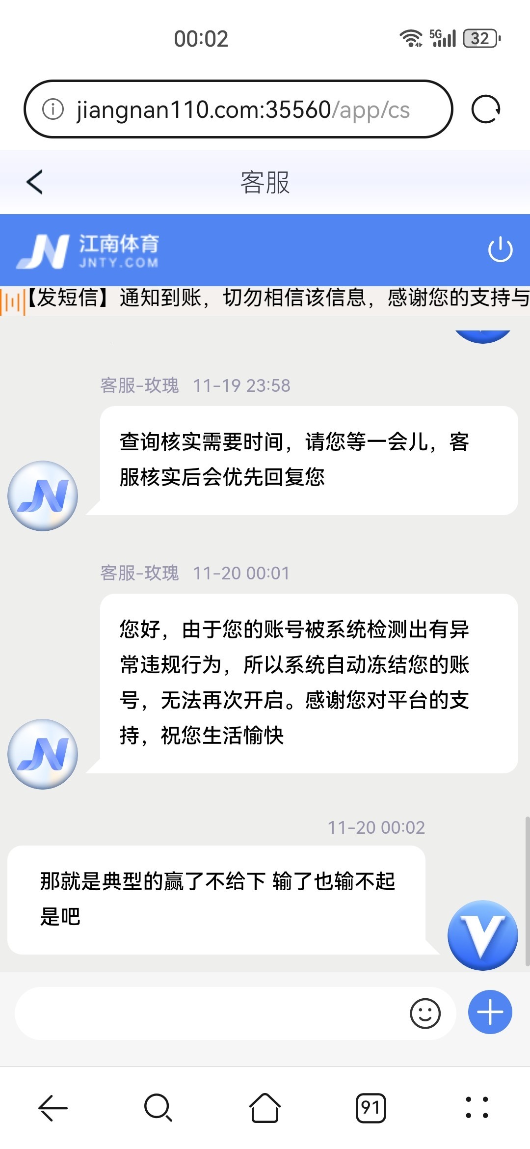 狗带说充100送46+8,我打到700下分,直接冻结账户说的单注异常!我她妈的打电子还能单注异常!真几把黑操!谁玩谁傻逼,典型的赢了不不起!输了也输不起的那种!江南体育的任何狗带都不要信,他们说他们的线很稳的,其实都是他妈的垃圾!被黑了也只能看着。千万不要玩着垃圾台。