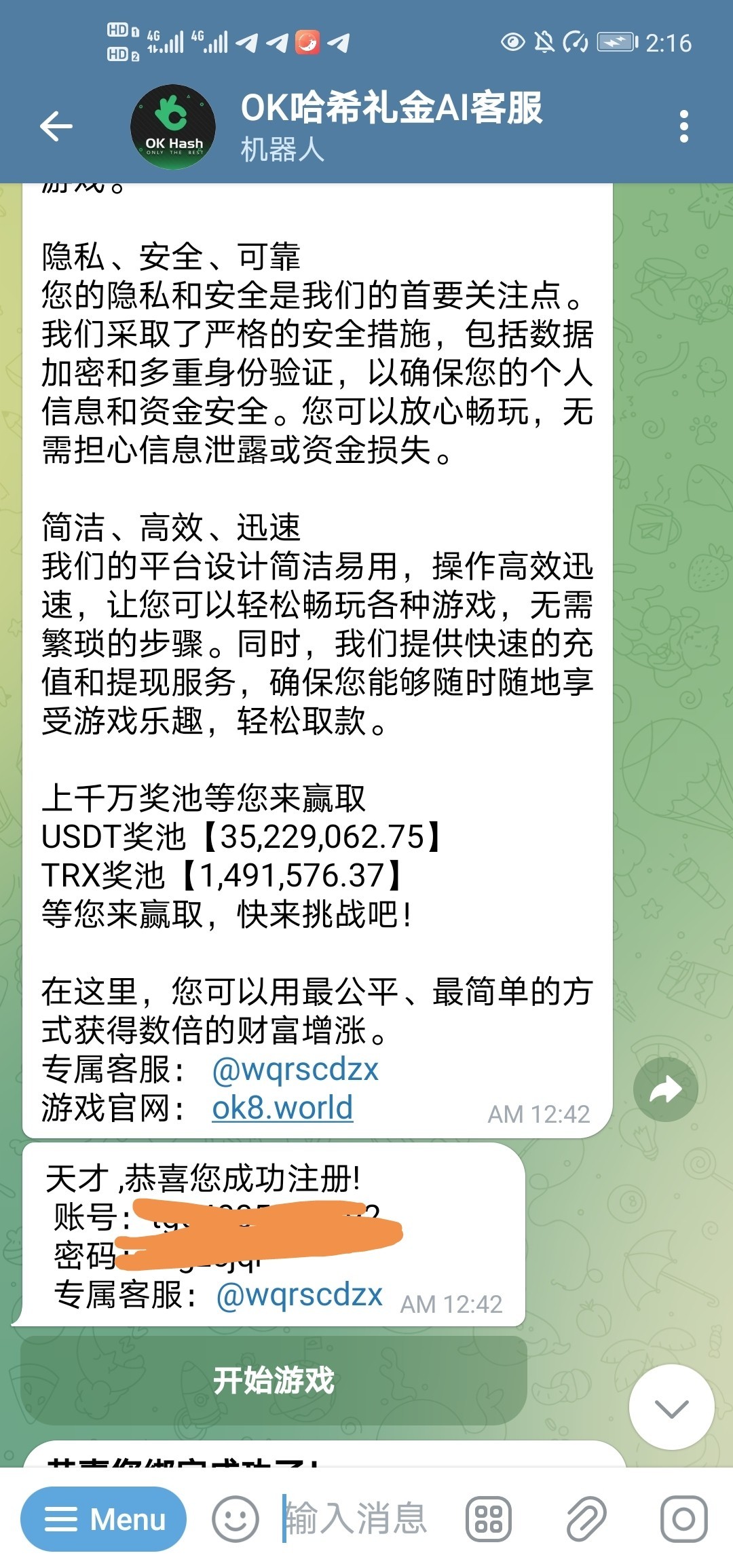 飞机机器人 https://t.me/okhash004_bot?start=684910飞机直接搜上面这个机器人,机器人会直接帮你注册账号,然后你直接点开始游戏 进去基本都秒送5usdt ,然后打五倍水 最高提现只能题10usdt
