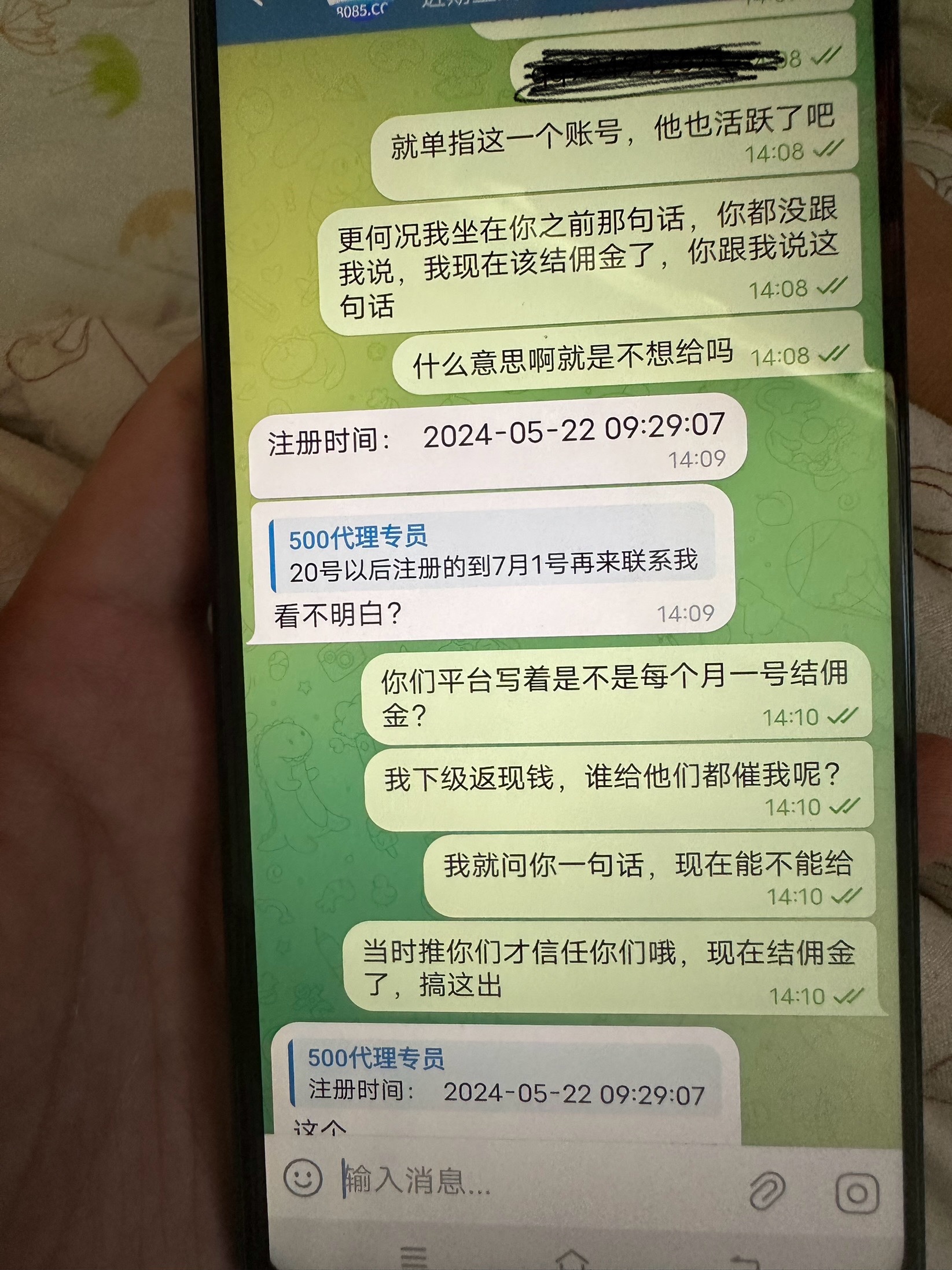 我刚开始推广的时候他就没给我说那个要求,等我该接人头费去了,他跟我说一堆要求说我先下什么各种不符合就我知道的,我一个朋友就帮我天天存,天天存也说我不符合说白了,这种狗逼平台就是没实力,佣金都不给接,还说20号注册的,让我7月1号去妈的,平台上面写着1号金佣金跟个狗揽子似的,广大网友认清500国际黑会员黑佣金黑代理