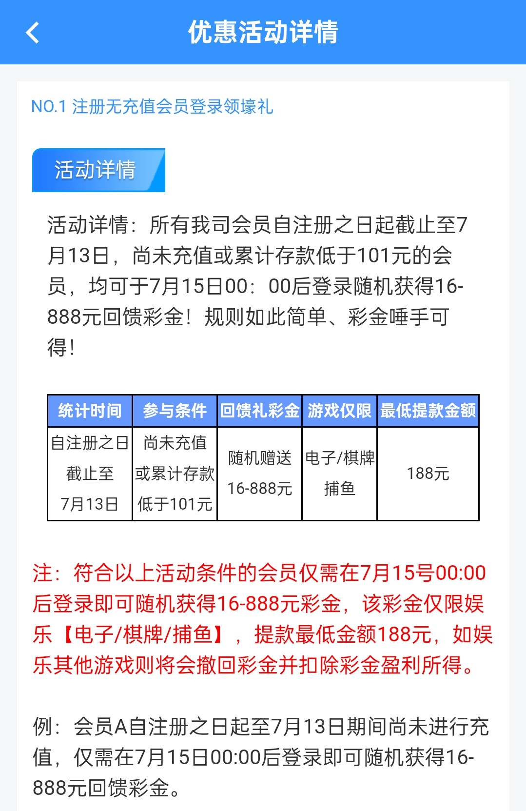 在今年7月13号之前注册的在15号12点后登入送16/888,限制电子棋牌捕鱼,最低提款188元(没有充值过的也有)