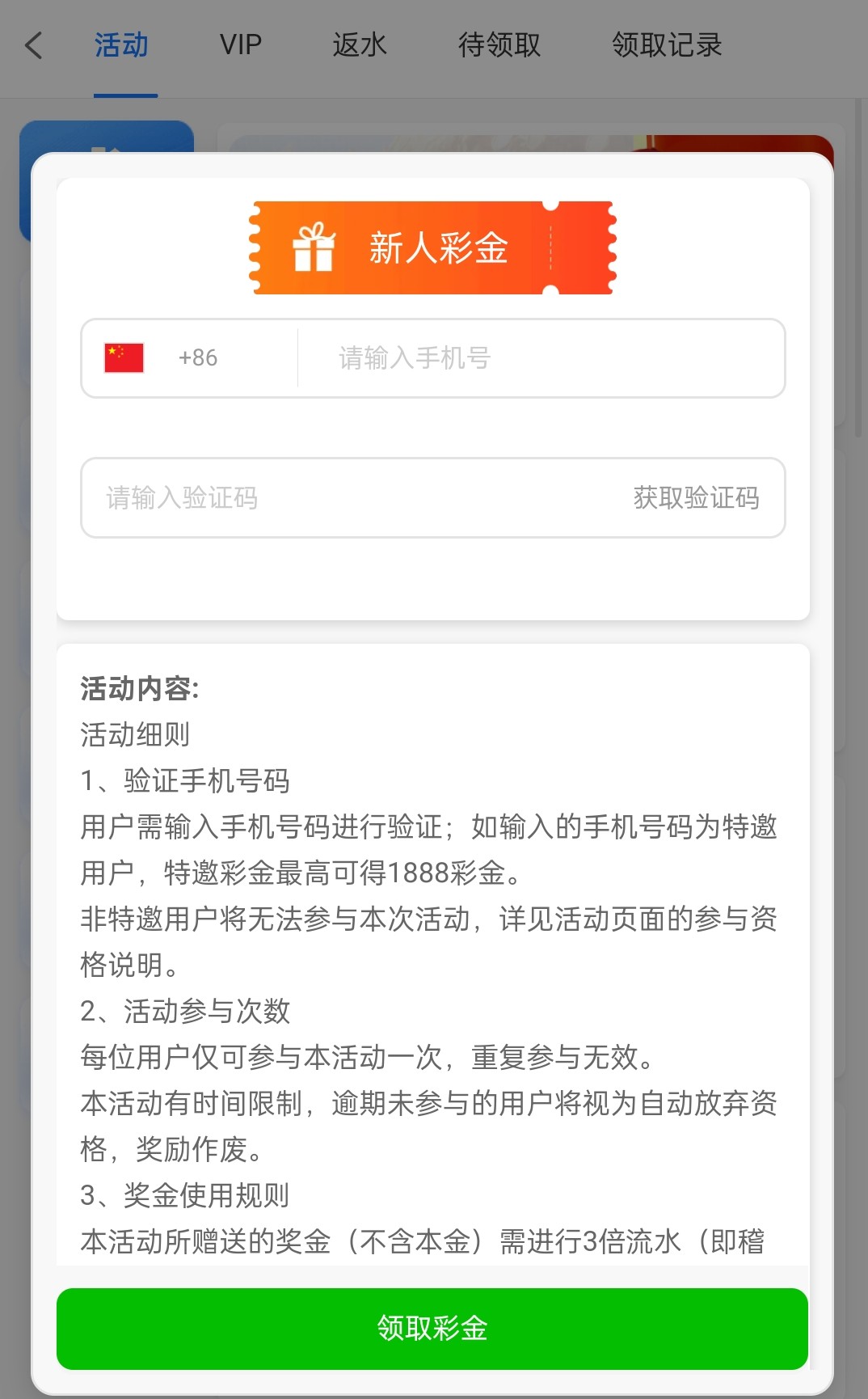 注册优惠里面第一个输入手机号完成验证限制3倍流水不是特邀会显示不符合碰瓷即可