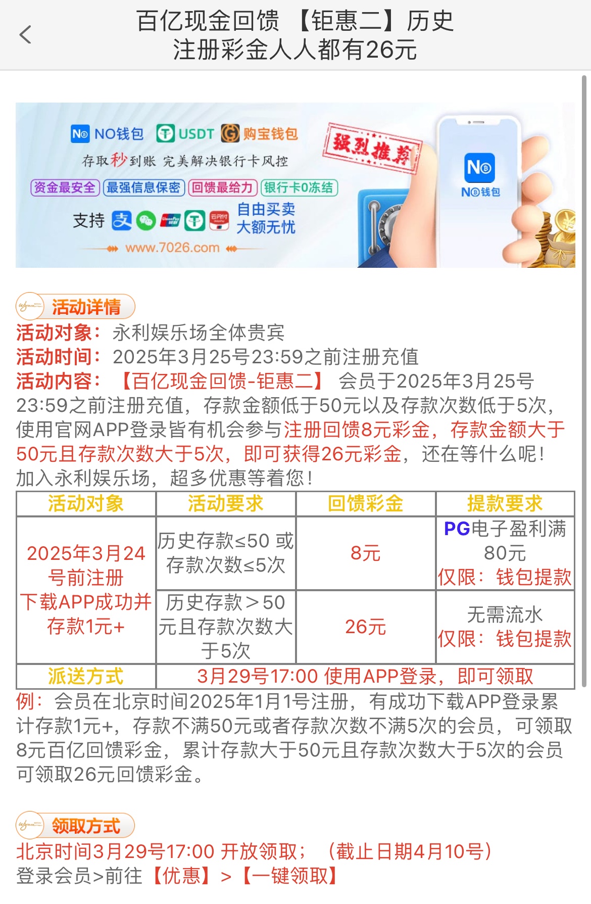 3月24号之前注册下载APP存款1+,历史存款不足50+存款次数不满5次送8,以上送26,具体自行查看优惠