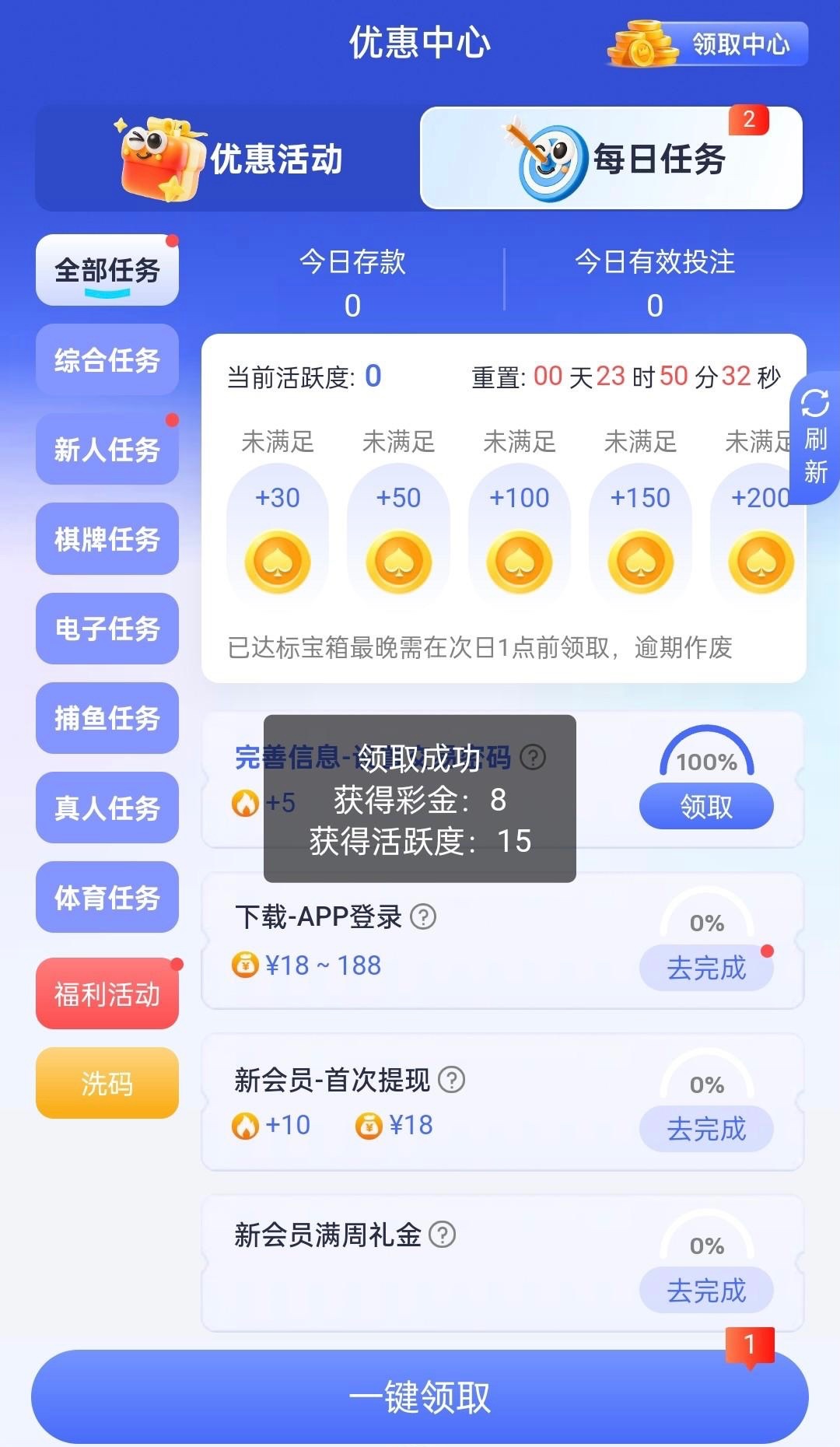 注册好完善信息任务里自助领取彩金