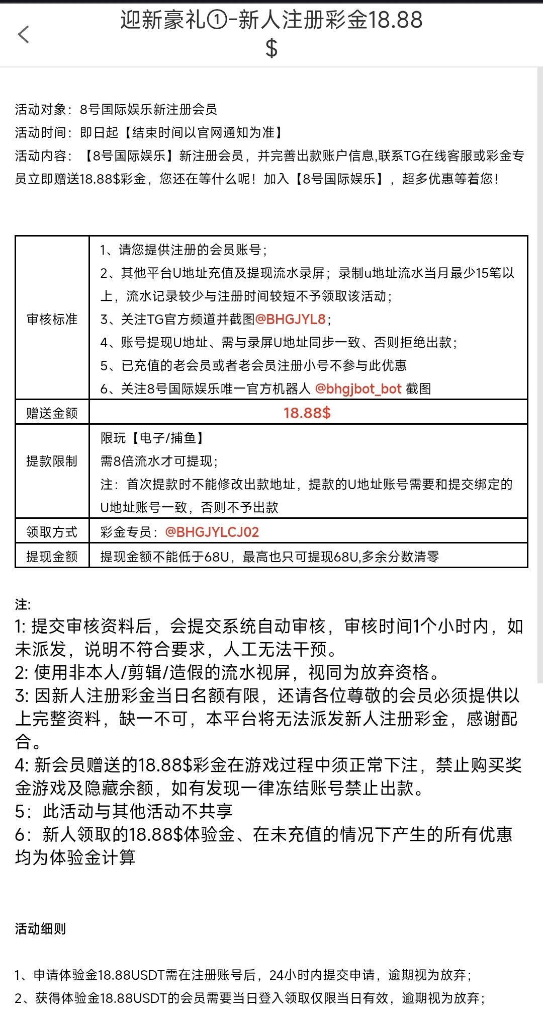 1.需要提供其它平台近一个月内最少15以上笔充值/提现流水录屏,流水少注册短领不了这个彩金