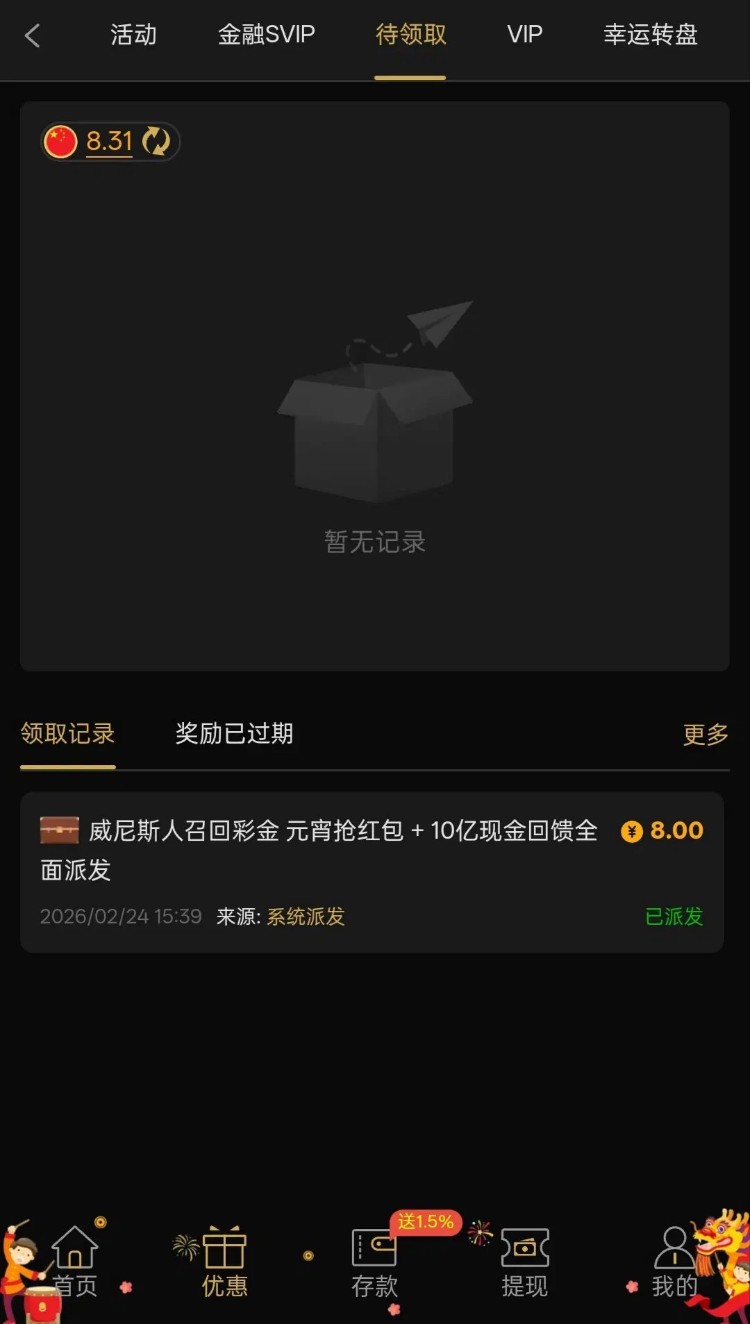 有账号的兄弟可以登入上看一下优惠里有没有这个彩金,有充值过可能就送的多一点,并不是人人都有