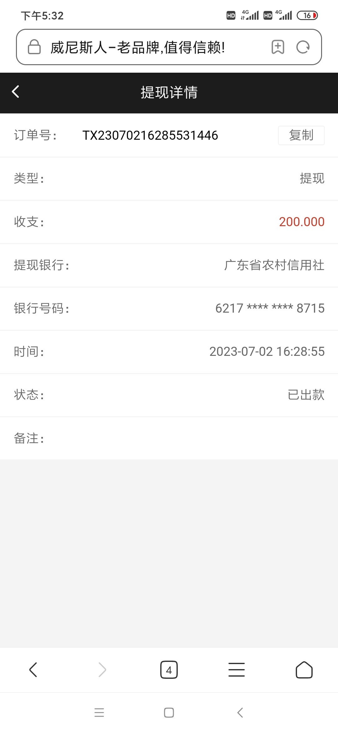 提现3个小时 到账了