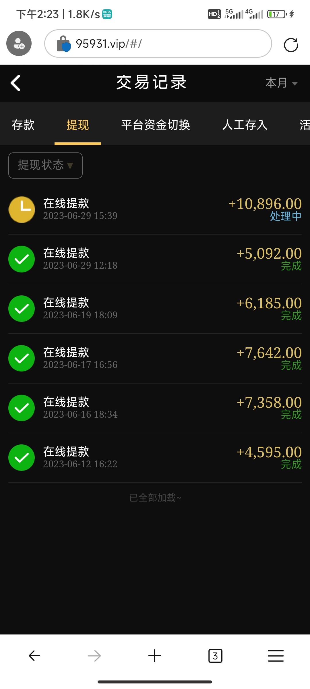 你这个前面给你提这么多    估计财务已经被电的不省人事了   后面换人了   你还敢提1w以上   不黑也得黑你了   现在台子   正规的  大额也都会黑了  因为日子不好过  除非是超级大客户  已经输了几百个的  大额给你   一般客户   绝逼黑你  包括玩了很久的   因为一般玩家几百个顶不过一个超级玩家   狗庄甚至懒得维护一般小玩家